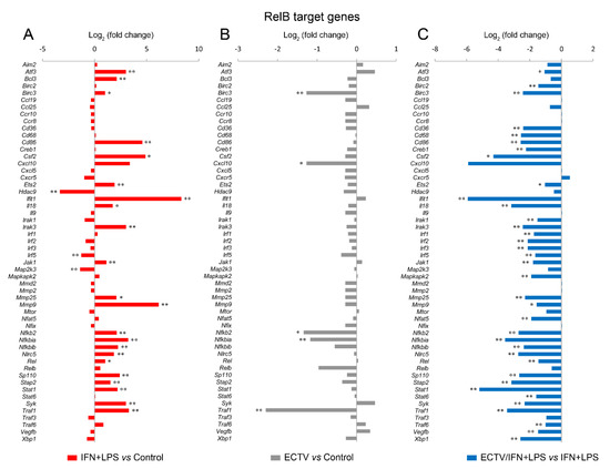 Since IFN-γ + LPS induced the nuclear translocation of RelB in RAW 264.7 cells, we expected that RelB target genes will be upregulated upon the stimulation of cells with these activators. To select the target genes of RelB, we used the TRANSFAC database of eukaryotic transcription factors [45]. After stimulation of RAW 264.7 cells with IFN-γ + LPS, we observed a significant upregulation of the following RelB target genes—Atf3, Bcl3, Birc3, Cd86, Csf2, Ets2, Ifit1, Il18, Irak3, Jak1, Mmp9, Mmp25, Nfkb2, Nfkbia, Nfkbib, Nlrc5, Rel, Sp110, Stap2, Stat1, Syk, and Traf1 (Figure 8A). In addition, IFN-γ + LPS treatment resulted in the downregulation of Hdac9, Irf5, and Map2k3 (Figure 8A). In ECTV-infected cells, in turn, downregulation of Birc3, Cxcl10, Nfkb2, Nfkbia, and Traf1 was observed (Figure 8B). However, ECTV downregulated Atf3, Birc2, Birc3, Cd36, Cd68, Cd86, Creb1, Csf2, Ets2, Ifit1, Il18, Irak1, Irak3, Irf1, Irf2, Irf3, Irf5, Jak1, Mapkapk2, Mmp9, Mmp29, Nfat5, Nfkb2, Nfkbia, Nfkbib, Nlrc5, Rel, Sp110, Stap2, Stat1, Stat6, Syk, Traf1, Traf6, Vegfb, and Xbp1 genes in IFN-γ + LPS-treated cells (Figure 8C). Next, we selected the genes encoding the major components of the noncanonical NF-κB signaling pathway and compared their mRNA expression in unstimulated versus poly(I:C)-treated cells and IFN-γ + LPS versus control cells. The role of poly(I:C) in the regulation of the noncanonical NF-κB signaling is, as previously mentioned, based on NF-κB2 activation [35]. However, our previous study has shown that the long-term stimulation of RAW 264.7 cells with poly(I:C) results in the nuclear translocation of RelA [24]. We observed that poly(I:C) upregulated the expression of Cd40 and Nfkb2, which are target genes of RelA [46], whereas IFN-γ + LPS upregulated the expression of Birc3, Cd40, and Nfkb2 and downregulated the expression of Ifngr1 and Tnfrsf11a (Figure 9A). ECTV, in turn, downregulated the expression of Birc3 and Tnfrsf12a. In poly(I:C)-treated cells, ECTV infection resulted in the inhibition of Birc3, Cd40, Chuk, Nfkb2, and Tnfrsf11a. In IFN-γ + LPS-treated cells, in turn, ECTV inhibited the expression of Birc2, Birc3, Cd40, Chuk, Ifngr1, Ltbr, Nfkb2, Tlr4, Tnfrsf11a, and Traf2 (Figure 9B). These results suggest that the function of the components of the noncanonical NF-κB signaling pathway is disrupted by ECTV.