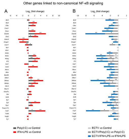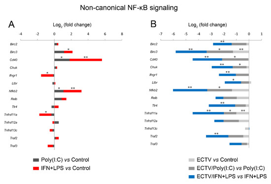 Our last question concerned the effect of ECTV on the expression of genes encoding the components of the noncanonical NF-κB signaling pathway. Due to the existing cross-talk between the two NF-κB signaling pathways, we investigated the effect of their inducers on the expression of the genes encoding the noncanonical NF-κB components and other genes related to noncanonical NF-κB signalling (Figure 7, Tables S1–S5).