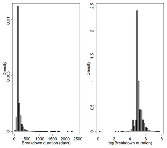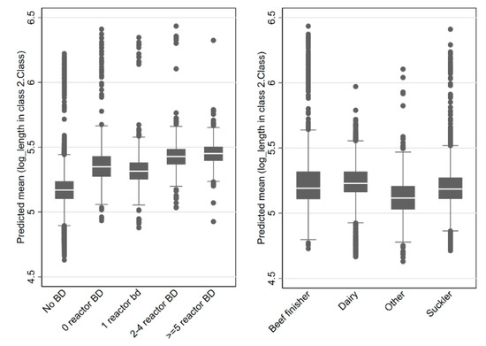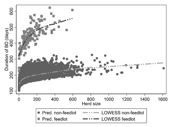Mycobacterium bovis infection, are a costly animal health challenge. Understanding factors associated with the duration of outbreaks, known as breakdowns, could lead to better disease management policy development. We undertook a retrospective observational study (2012–2018) and employed Finite Mixture Models (FMM) to model the outcome parameter, and to investigate how factors were associated with duration for differing subpopulations identified. In addition to traditional risk factors (e.g., herd size, bTB history), we also explored farm geographic area, parcels/farm fragmentation, metrics of intensity via nitrogen loading, and whether herds were designated controlled beef finishing units (CBFU) as potential risk factors for increased duration. The final model fitted log-normal distributions, with two latent classes (k) which partitioned the population into a subpopulation around the central tendency of the distribution, and a second around the tails of the distribution. The latter subpopulation included longer breakdowns of policy interest. Increasing duration was positively associated with recent (<3 years) TB history and the number of reactors disclosed, (log) herd size, beef herd-type relative to other herd types, number of land parcels, area, being designated a CBFU (“feedlot”) and having high annual inward cattle movements within the “tails” subpopulation. Breakdown length was negatively associated with the year of commencement of breakdown (i.e., a decreasing trend) and non-significantly with the organic nitrogen produced on the farm (N kg/hectare), a measure of stocking density. The latter finding may be due to confounding effects with herd size and area. Most variables contributed only moderately to explaining variation in breakdown duration, that is, they had moderate size effects on duration. Herd-size and CBFU had greater effect sizes on the outcome. The findings contribute to evidence-based policy formation in Ireland.