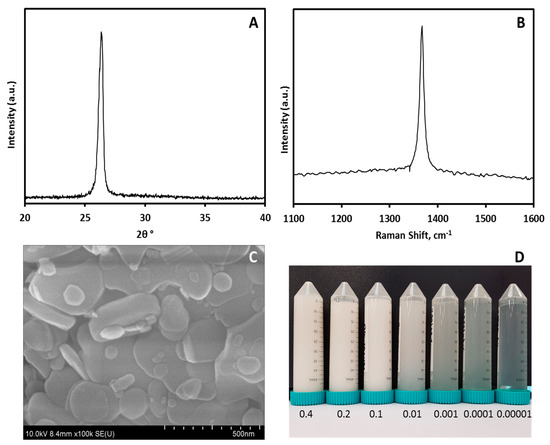 (A) Powder X-ray diffraction (XRD) on hBN nanoparticles at atmospheric pressure. (B) Raman Spectra of hBN nanoparticles. (C) Field Emission Scanning Electron Microscopic (FESEM) image of hBN measured at 10 kV vacuum condition. (D) Serially diluted samples of hBN-ddH2O from a stock of 0.4 wt %.