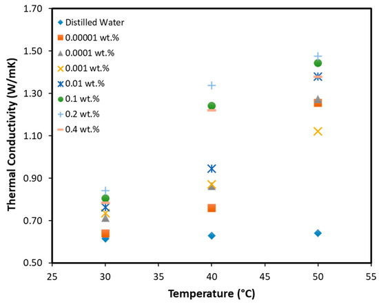 Convective heat transfer is a function of the thermal conductivity of the fluid. The thermal conductivity measurements on nanofluids have shown that the conductivity is inversely proportional to the size of the nanoparticle. Other possible reasons for enhanced thermal conductivity include Brownian motion of particles, molecular level layering at the liquid-particle interface, the formation of percolation network, and nanoparticle clustering [15]. Figure 2 shows the thermal conductivity of hBN nanofluids with respect to increasing temperature at all the concentrations used in this study. Results indicate that the thermal conductivity of the samples is a vital function of particle concentration and temperature. The highest enhancement in thermal conductivity was 141.9 W/mk with 0.2 wt % hBN. High thermal conductivity could also be attributed to the highly crystalline nature of the hBN powder used in this study, which might induce longer phonon scattering mean free path [33]. Further increase in the concentration may not help since agglomeration would result in sedimentation affecting the thermal conductivity unless the particles are functionalized [34]. It is also proposed that the higher concentration leads to nanoparticle populated network, which is not as efficient as the co-existence of dynamic free particles and local clusters, which could lead to lower conductivity at higher temperatures. Moreover, the higher concentration would also contribute to the increase in heat capacity of the reaction, which may affect the yield and reaction fidelity.