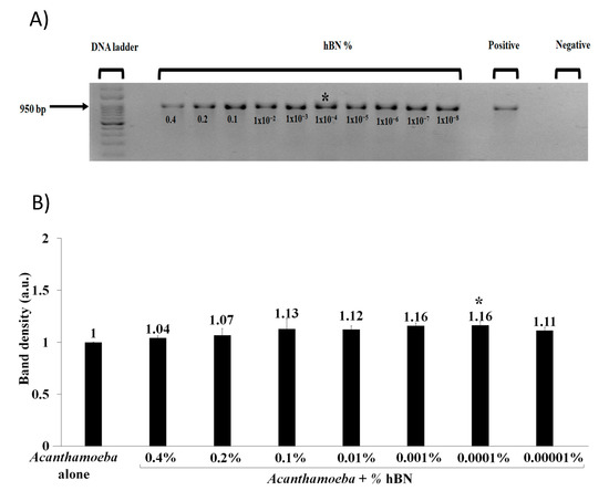 (A) Agarose gel image showing concentration-dependent hBN nanoparticles effects on PCR amplification of A. castellanii. Lane “hBN %” indicates 0.4–1 × 10−8 wt % hBN nanoparticle concentration in PCR along with 10,000 A. castellanii cells enhanced PCR products in gradual increments of DNA yield. An expected amplicon size of 950 bp was obtained. Lane positive control indicates PCR reaction with a DNA template but without hBN nanoparticles. Lane negative control indicates PCR reaction with distilled water but without added DNA template and hBN nanoparticles. (B) Quantitative graph of 950 bp Acanthamoeba PCR band density in the presence of (0.4–1 × 10−8 wt %) hBN nanoparticles against the absence of hBN nanoparticles. The PCR amplicon in the absence of nanoparticles was considered as 1 arbitrary unit (a.u.) compared to amplicons in the presence of hBN nanoparticles as relative amounts of PCR yield increase. Note hBN nanoparticles improved Acanthamoeba PCR yield by ~16% at maximum optimum concentration of 1 × 10−4 wt % indicated in both (A) and (B) with (*).