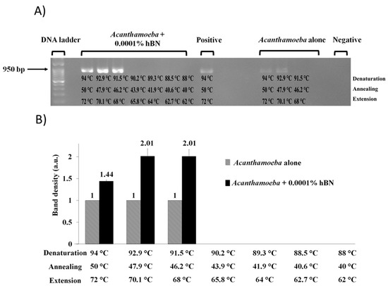 (A) Agarose gel image showing a range of reduced temperature-dependent effects on PCR amplification of A. castellanii. Lane “Acanthamoeba + 0.0001% hBN” indicates 1 × 10−4 wt % optimum hBN concentration along with 10,000 A. castellanii enhanced Acanthamoeba PCR products in gradual increments of DNA yield at reduced PCR temperatures for denaturation, annealing, and extension. An expected amplicon size of 950 bp was obtained. Lane positive control and “Acanthamoeba alone” indicates PCR reaction with DNA template but without hBN nanoparticle. Lane negative control indicates PCR reaction with distilled water but without added DNA template and hBN nanoparticle. (B) Quantitative graph of 950 bp Acanthamoeba PCR band density in the presence of hBN nanoparticle against the absence of hBN nanoparticles at reduced PCR temperatures for denaturation, annealing and extension. The PCR amplicon in the absence of nanoparticles was measured as 1 arbitrary unit (a.u.) compared to amplicons in presence of hBN nanoparticles as relative amounts of PCR yield increase. Note 1 × 10−4 wt % optimum hBN nanoparticle concentration improved Acanthamoeba PCR yield by ~100% at lowest 46.2 °C annealing temperature.