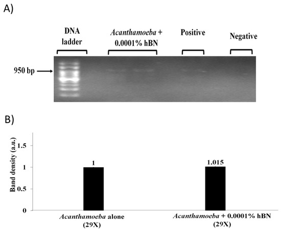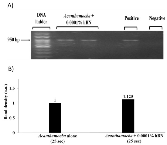 To test the effects of hBN nanoparticle on Acanthamoeba detection at reduced PCR cycle time an optimum nanoparticle concentration was added to PCR reaction mixture containing 10,000 A. castellanii cells. Gel image results revealed that reduction in PCR cycle number from 40× to 29× using 1 × 10−4 wt % hBN optimum nanoparticle concentration did not cause any decrease in the amount of amplified PCR product compared to the Acanthamoeba positive control without hBN nanoparticles, suggesting that hBN nanoparticles can rapidly reduce overall PCR cycle number by 11× and time by 32 min; thus, enhancing Acanthamoeba detection (Figure 7A). Quantification of band density in gel images showed that 1 × 10−4 wt % hBN optimum nanoparticle concentration partially improved Acanthamoeba DNA yield at 29 cycles (Figure 7B).