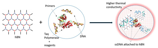 Nanotechnology has emerged with the nanomaterial-assisted PCR (NanoPCR) technique, which introduces nanomaterials into the PCR mixture tto enhance PCR thermal conductivity. Since heat transfer limitation exists in the conventional PCR thermal cycler and is known to reduce PCR reaction efficiency, nano-PCR can address this issue by combining nanomaterials with excellent thermal conductivity properties into a PCR reaction to selectively increase target DNA yield and enhance PCR efficiency [10]. Nanoparticles ranging from 1 to 100 nm in size provide a conducive interface for DNA interactions due to the high surface area to volume ratio. Since nanoparticles possess unique physicochemical properties, significantly higher thermal conductivity, they are efficient PCR enhancers [11]. Graphene nanoparticle was proven to not only enhance PCR specificity but also maintain its fidelity [12]. hBN is an analogue of graphene and exists as a white crystalline solid compound within an ordered arrangement of Boron and Nitrogen atoms in a two-dimensional plane, giving rise to its most stable hexagonal honeycomb layered structure. Hence, the property of hexagonal boron nitride (hBN) is of interest as a potential nanomaterial because of characteristic resemblance to its analogue called graphene. hBN compound is inert and does not oxidize in air up to 900 °C. It possesses high thermal conductivity and is non-toxic in the environment [13], making it highly suitable as a nanoparticle to enhance PCR efficiency.