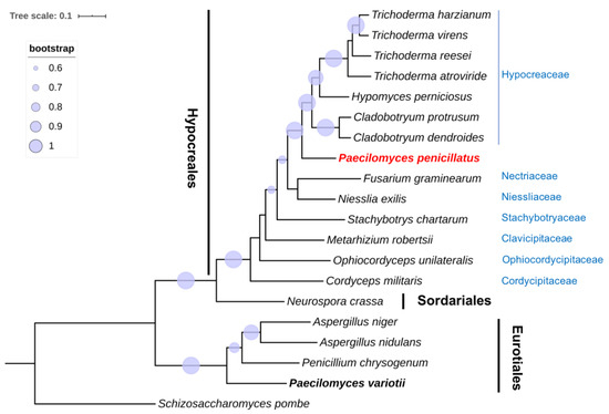 Phylogenetic analysis of single-copy orthologous genes of P. penicillatus and 13 representative species of Hypocreales, one Sordariales species, and four Eurotiales species. S. pombe was used as an outgroup for this analysis. P. variotii is indicated in bold font, and P. pencililatus is highlighted in red font. Families of Hypocreales are labeled in blue font. The phylogenetic tree was generated using the maximum-likelihood method with 1000 bootstrap replicates. The tree scale indicates residue substitutions per site. Only bootstrap values greater than 0.6 are displayed.