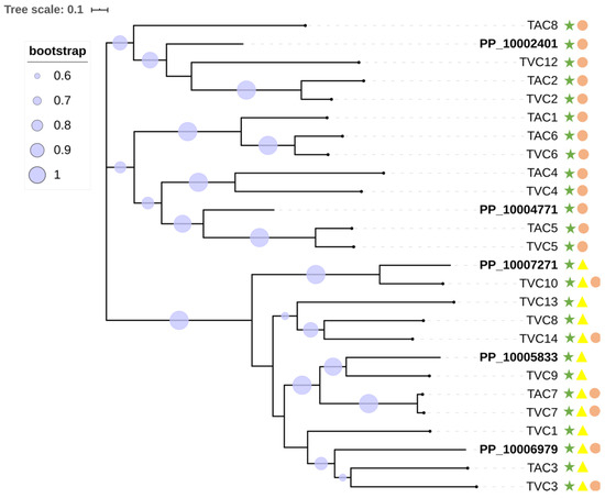 Phylogenetic relationships of P. penicillatus, T. atroviride, and T. virens sgC chitinases. The presence of GH18 modules (IPR001223) is indicated with green stars, LysMs (IPR018392) are indicated in yellow triangles, and CBM18s (IPR001002) are represented by pink circles.