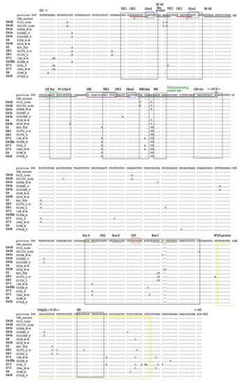 Transfections with plasmids pLTR-011L, pLTR-0168BP, pLTR-001B, and pLTR-014W revealed slightly increased luciferase activity (2-fold enhancement). The difference in luciferase activity level between the pLTR-WT and different pLTRs was analyzed by Mann–Whitney U test and p-values are shown in Table S1. HeLa cells transfected with plasmids pLTR-00111P, pLTR-01610BP, and pLTR-019L showed notably increased luciferase activity (2.3–3.7-fold) (Figure 2, Table S1). These three LTR variants harbored notable mutations, A(−137)G, A(−135)G, and A(−134)G in κB-like site; G(−43)T in TATA box; C(-53)A in CRE3; and T(+113)G in putative Myc-associated zinc finger protein (MAZ).