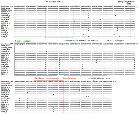 Alignment of the translated Tax protein amino acid sequences from fifteen select BLV variants. The points at which the translated amino acid sequence of the analyzed proviral Tax gene differ are indicated below the reference 344 strain sequence. Functionally important regions are identified with boxes: black denotes Zn finger domain and phosphorylation sites; green boxes denote T-cell epitopes and B-cell epitope; violet denotes Leucine-rich activation domain; red denotes the multifunctional domain. CD8+ CTL epitopes are underlined by a blue line.