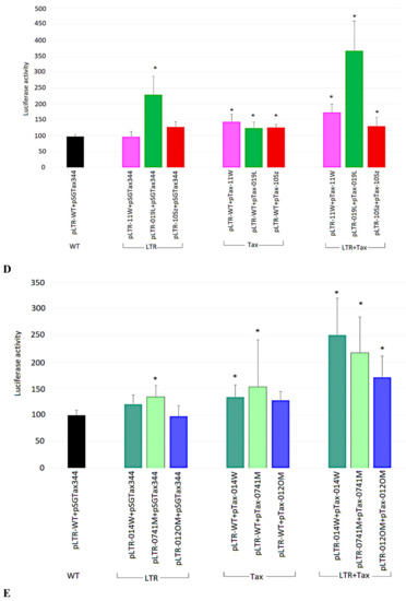 HeLa cells cotransfected with pLTR-001B, pLTR-0137O, pLTR-011TL, or pLTR-FLK and corresponding Tax plasmids (pTax-001B, pTax-0137O, pTax-011TL, and pTax-FLK, respectively) revealed promoter activity comparable to the reference plasmid (by 1.0- to 1.2-fold) (Figure 6B,C and Table S1). Cells cotransfected with pLTR-00111P, pLTR-0094B, pLTR-031W, pLTR-11W, pLTR-10Sz, or pLTR-012OM and corresponding Tax plasmids (pTax-00111P, pTax-0094B, pTax-031W, pTax-11W, pTax-10Sz, and pTax-012OM, respectively) revealed promoter activities 1.3- to 2.0-fold higher than the pLTR-WT and pSGTax344 reference combination (Figure 6A,D,E; Table S1).