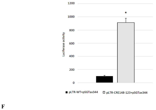 In contrast, cotransfection of pLTR-011L, pLTR-0168BP, pLTR-01610BP, pLTR-014W, or pLTR-0741M with corresponding Tax plasmids (pTax-011L, pTax-0168BP, pTax-01610BP, pTax-014W, and pTax-0741M, respectively) resulted in promoter activity 2.1- to 3.0-fold higher than the reference combination (Figure 6A,B,E; Table S1). HeLa transfected with the pLTR-019L plasmid and pTax-019L plasmid showed promoter activity 3.7-fold higher than the reference plasmid (Figure 6D). The pLTR-CRE148-123 plasmid, harboring two consensus CRE sequences TGACGTCA in CRE1 and CRE2 motif, cotransfected with pSGTax344 reference plasmid showed promoter activity almost 10-fold higher than the reference strain pLTR-WT and pSGTax344 combination (Figure 6F).