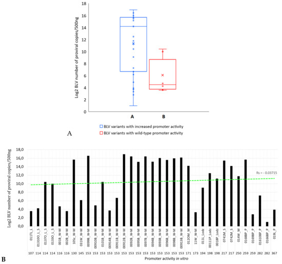 (A,B): Proviral load in thirty-five BLV isolates. (A) Box and whiskers plot features are as follows: central line in box is median, bottom line of box is first quartile (25%), top line of box is third quartile (75%), diamond is mean, bottom of whiskers is minimum value of copy number, top of whiskers is max copy number, and dots are raw values. Number of proviral copies is plotted on a base-2 logarithmic scale. Group A, variants with elevated transcriptional activity; group B, variants with reference strain transcriptional activity. Groups A and B were compared by using the Mann–Whitney U test, p < 0.03734. (B) Correlation between proviral copy numbers and promoter activity in vitro for the studied variants. The values of promoter activity were sorted on the x-axis from the lowest to the highest. There was no statistical correlation between the variables observed (Rs = −0.03715, p > 0.05). The light-green dashed line indicates the trend line.