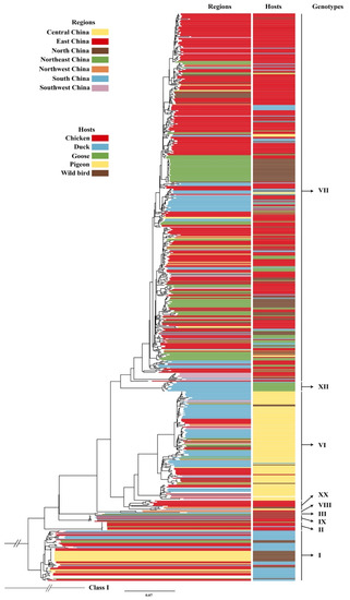 In China, the genotype VII NDVs were dominant circulating genotype, contributing to most ND outbreaks in poultry, while VIII, IX, and XII virulent NDVs were also occasionally reported [12,13,14]. Of note, the genotype VI virulent NDVs, referred to pigeon paramyxovirus type 1, also identified in China, inducing disease in pigeons, but show nonvirulence to chicken [15,16]. According to the updated classification criteria of NDV sub-genotypes—in which the cutoff value of the nucleotide distance was increased from 3% to 5%—all genotype VII NDV strains were divided into three groups, VII.1.1 (formerly VIIb, VIId, VIIe, VIIj, and VIIl), VII.1.2 (former VIIf), and VII.2 (former VIIh, VIIi, and VIIk) [8]. Previous studies have revealed the molecular characteristics and pathogenicity of NDV isolated from China [9,10,11,17,18,19,20]. However, the evolutionary dynamics of genotype VII NDVs and viral migration transmission across different hosts as well as regions in China, remained largely unknown.