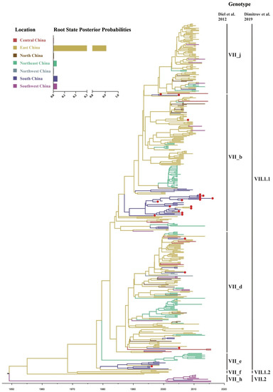 Because of its dominant role in the NDV epidemic in China, genotype VII was specifically targeted for follow-up analysis. A root-to-tip regression analysis of genotype VII NDVs showed a correlation coefficient and R2 of 0.6554 and 0.4295, respectively, confirming the presence of temporal structure. To estimate the geographic origin and the most significant epidemiological links of genotype VII NDVs in China, a discrete trait Bayesian phylogeographic method and a Bayesian Stochastic Search Variable Selection (BSSVS) procedure were implemented with different regions and hosts. The time-scaled maximum clade credibility (MCC) tree of genotype VII NDVs showed that these viruses isolated from China comprised three sub-genotypes, VII.1.1, VII.1.2, and VII.2, according to the recent classification system described by Dimitrov et al. [8] (Figure 4). Sub-genotype VII.1.1 was the dominant cluster from 1995 to 2019 (404/420, 96.2%) and contained sub-genotypes VII_b, VII_d, VII_e, and VII_j, which had been previously classified according to the criteria by Diel, et al. [29]. Our Bayesian phylogenetic analysis also showed that genotype VII probably firstly emerged in East China (root posterior probability = 0.91), with the time of most recent common ancestor (TMRCA) around 1951 (95% HPD: 1941–1960), well before the submission of the first genotype VII NDV sequence from China to GenBank (Figure 4).