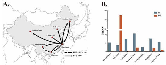 Spatial diffusion of genotype VII NDVs in China. Only statistically supported migrations with BF > 3 are shown. (A) Spatial diffusion pathways. (B) Histogram of the total number of state transitions.
