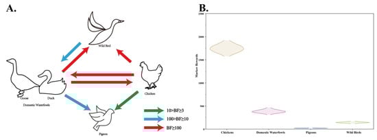 (A) Host transition of genotype VII NDVs in China. Only statistically supported migrations with BF > 3 are shown. (B) Density distribution of the total time spent in a particular host population (Markov rewards).