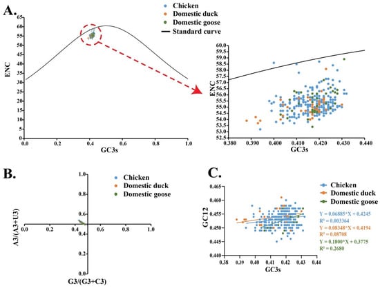 Nearly all the data points were clustered below the standard curve in an effective number of codons (ENC) analysis based on different species, with only a few points located on or near the standard curve. If a genome lies on the standard curve (ENC expectation as a function of GC3s content), it indicates that codon usage bias is only affected by mutation pressure [30]. Hence, our ENC result indicates that factors other mutational pressure, such as natural selection were the dominant factors that influenced the codon usage bias (Figure 8A). In the parity rule 2 (PR2) plot, all points were separated from the center of the figure (both horizontal and vertical coordinates were 0.5), providing further evidence that codon usage bias was likely determined by multiple factors, including mutation pressure and natural selection (Figure 8B). Neutrality analysis revealed a narrow distribution and low GC3s values (0.432–0.388). To decipher the effects of mutational pressure and natural selection in different hosts, regression analyses were performed. We found the slopes of chicken group, domestic duck group, and domestic geese group were 0.06885, 0.08348, and 0.1800, respectively, indicating that the influence of mutation pressure on codon usage bias in the F gene was 6.89%, 8.35%, and 18.00% in chickens, domestic ducks, and domestic geese, respectively (Figure 8C).
