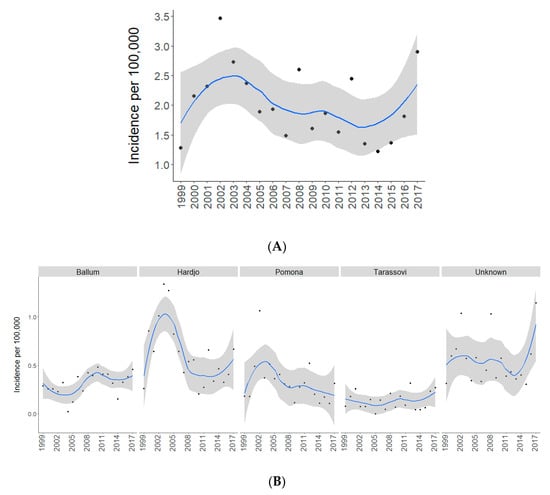 Time series of yearly incidence of notified leptospirosis cases in New Zealand, 1999 to 2017. (A) Total annual incidence per 100 000 and (B) serovar-specific annual incidence per 100,000. Dots indicate yearly incidence and blue lines represent Loess-smoothed incidence with 95% confidence intervals shown in grey.