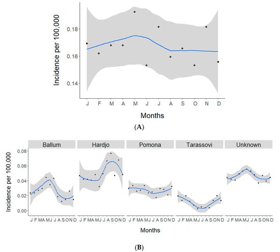 Time series of monthly incidences of notified leptospirosis cases in New Zealand, 1999 to 2017. (A) Total average monthly incidence per 100,000, (B) serovar-specific average monthly incidence per 100,000. Each dot indicates the average monthly incidence of 19 years and blue lines represent Loess-smoothed incidence with 95% confidence intervals shown in grey.