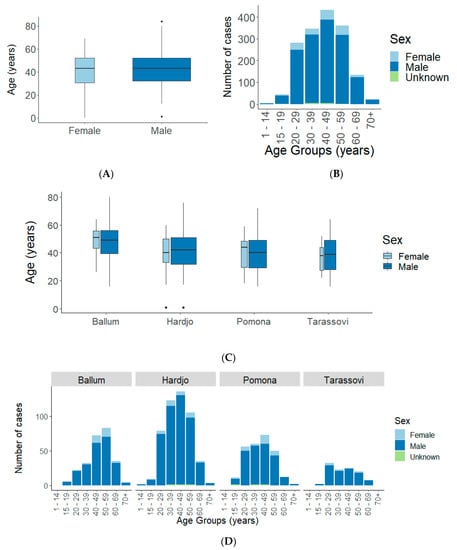 Data on sex were available for 99.4% (1617/1627) of all cases and age was available for all except one case. Males accounted for 89.6% (1449/1617) of cases with an average annual incidence of 3.65/100,000. Females accounted for 10.4% (168/1617) of cases with an average annual incidence of 0.41/100,000. Median ages of males (43 years, IQR 32–52), and females (43 years, IQR 30.5–52) were the same (Figure 3A) and the distribution of ages shows 40–49 years with the highest number of notifications for both sexes (Figure 3B). Serovar-specific median age shows Ballum cases were older (males: 49 years, IQR 39.5–56, and females: 51 years, IQR 43.25–55.75), while Tarassovi cases were younger (males: 39 years, IQR 28–49, females: 38 years, IQR 27.5–44, Figure 3C). The most notified age group for Ballum was 50–59 years, for Hardjo and Pomona it was 40–49 years and for Tarassovi it was 20–29 years (Figure 3D).