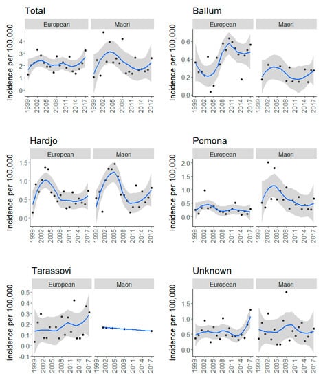 Total and serovar-specific time series of yearly incidences of notified European and Māori leptospirosis cases in New Zealand, 1999 to 2017. Dots indicate yearly incidences and blue lines represent Loess-smoothed incidence with 95% confidence intervals shown in grey.