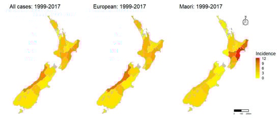 Choropleth maps of average annual incidence per 100,000 of notified leptospirosis cases by District Health Boards in New Zealand for the entire study period (1999–2017) for all cases, Europeans cases and Māori cases.