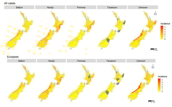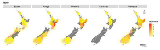 District Health Board incidences stratified by serovar showed Ballum predominated in West Coast and Northland in all cases and Europeans while for Māori, Ballum predominated in West Coast and Wairarapa (Figure 6). For the remaining three serovars, Hardjo, Pomona and Tarassovi, the spatial patterns were similar for all cases and for cases stratified by ethnicity, i.e., Hardjo predominated in Hawke’s Bay, Pomona predominated in Hawke’s Bay and Tairawhiti, and Tarassovi predominated in Waikato, Taranaki and Northland (Figure 6).