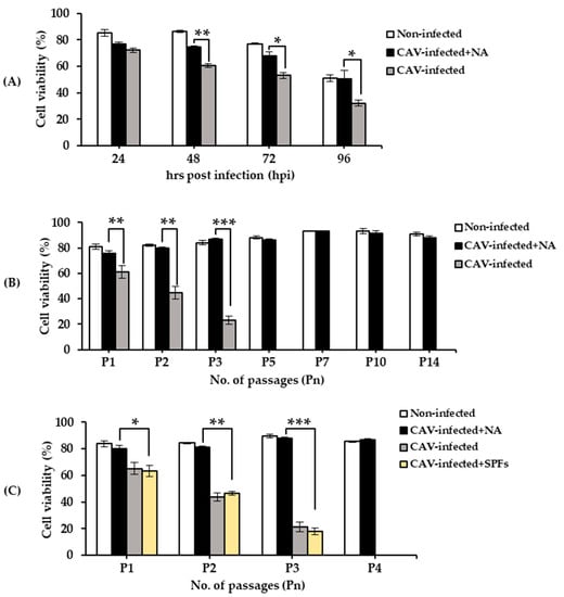 Detection of cell viability within non-infected, CAV-infected cells cultured in the absence of NA (CAV-infected), and CAV-infected cells cultured in the presence of NA (CAV-infected + NA) in (A) the time course and (B) passage. The passage study including the control group (CAV-infected + SPFs) was repeated for P1–P4 (C). *, **, and *** indicate significant differences (p < 0.05, p < 0.01, and p < 0.001, respectively). Data are represented as the mean ± standard deviation (S.D.); n = 3. CAV, chicken anemia virus; NA, neutralizing antibody; SPF, specific-pathogen-free.