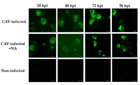 Detection of CAV antigens within CAV-infected and CAV-infected + NA during the time course. IFAT (indirect fluorescent antibody test) was conducted to capture viral antigens using chicken anti-A2/76 serum and FITC-conjugated rabbit anti-chicken IgG. CAV-infected and CAV-infected + NA were collected at 24, 48, 72, and 96 h post-infection (hpi) and used as antigens. Non-infected cells were used as negative control. Bar: 10 µm.