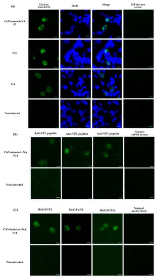 CAV antigens in the infected cells were detectable by an indirect fluorescent antibody test (IFAT) using antiserum to the CAV/A2/76 strain (chicken anti-A2/76). The granular shapes observed were regarded as CAV antigens in both CAV-infected and the CAV-infected + NA cells at 24, 48, 72, and 96 hpi (Figure 2). CAV antigens were also confirmed in CAV-infected + NA cells at the fifth passage (P5), P10, and P14. By contrast, no fluorescence signal was observed in non-infected cells at the same passages (Figure 3A). VP1, VP2, and VP3 antigens were detected in CAV-infected + NA cells at P14 (Figure 3B,C).