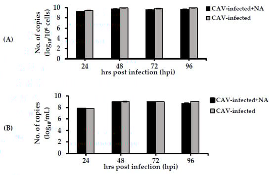 Real-time PCR was conducted to detect CAV DNA, and results were calculated as the log10 number of copies per one million cells for infected cells and log10 number of copies/mL within cell supernatants (sups). There was no significant difference in the amount of viral DNA between the CAV-infected (9.45 ± 0.09 log10 copies/106 cells) and CAV-infected + NA (9.29 ± 0.02 log10 copies/106 cells) cells at 24 hpi. The results were similar at 48, 72, and 96 hpi (Figure 4A). In the sups, at 24 hpi, the levels of CAV DNA were 7.81 ± 0.01 and 7.76 ± 0.02 log10 copies/mL within CAV-infected and CAV-infected + NA cells, respectively. Virus copy numbers in the sup at 48 hpi were 9.01 ± 0.1 and 8.97 ± 0.05 in the CAV-infected and CAV-infected + NA cells, respectively, and remained at such high levels at 72 and 96 hpi (Figure 4B).