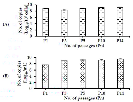 CAV DNA was detected at high levels during passage until P14 in both the cells and sup of CAV-infected + NA cells (Figure 5A,B). There was no significant difference in the amount of CAV DNA between different passages in the infected or CAV-infected + NA cells (Figure 5A). Amounts of CAV DNA in the sup were 7.66 ± 0.07 log10 copies/mL at P1, 9.01 ± 0.02 log10 copies/mL at P3, and remained at these elevated levels throughout the passage (Figure 5B).