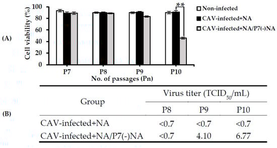 The sups of CAV-infected + NA/P7(-)NA and CAV-infected + NA cells were collected at P8, P9, and P10 and were subjected to virus isolation in MSB1 cells. The results indicated that virus titers increased to 6.77 log10 TCID50/mL in the sup of the CAV-infected + NA/P7(-)NA, whereas no virus recovery was detected from the CAV-infected + NA (Figure 6B) cells, similarly to the results presented in Table 1.