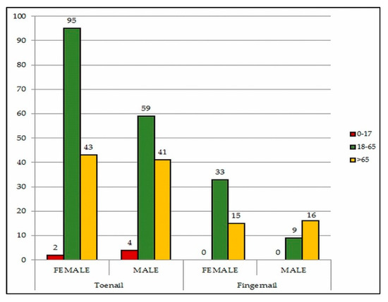 There is also a substantial impact of several risk factors and comorbidities underlying the pathogenesis and distribution of onychomycosis. Advanced age is an important risk factor in onychomycosis’ development and according to our results more than one-third of the infected individuals were over 65 years old, while children aged 0-17 were less infected (1.9%). Both the most increased and the lowest fungal isolation rates of onychomycosis among elderly patients and children, respectively, are consistent with the results observed in other studies [13,17,20,32]. Age-associated immune deficits in association with several disorders, consecutive nail trauma, or dystrophic and thickened nails may predispose to onychomycoses among elderly patients [4,5,20].