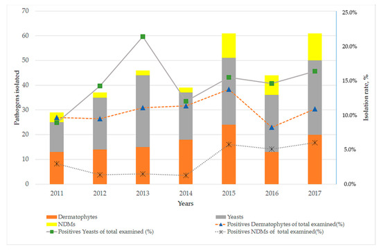 According to past medical history 87 out of 317 patients (27.4%) had fungal skin or/and nail infection or nail trauma. Furthermore, associated comorbidities were reported in 120 out of 317 diagnosed cases (37.9%); diabetes mellitus was the predominant abnormality (18.3%), followed by immunosuppression (5.4%), rheumatoid arthritis (3.5%) and psoriasis (3.2%). Regarding the main etiological agent involved in onychomycosis, the most frequently isolated pathogens in our study were yeasts (50.8%), followed by dermatophytes (36.9%) and NDMs (12.3%). Annual distribution of the investigated individuals and isolation rate of fungi recovered from 2011 to 2017 is shown in Figure 2.