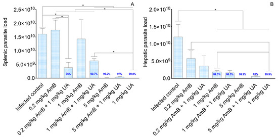 Hamsters infected with L. (L.) infantum and treated with 0.2 and 1.0 mg/kg AmB did not reduce splenic parasitism in comparison to the infected control but when 1.0 mg/kg of UA was added to these doses of AmB, significant reductions in tissue parasitism (76 and 60.7, respectively, p < 0.05) were observed (Figure 1A). Animals treated with 5.0 mg/kg AmB alone or associated to UA (5.0 mg/kg AmB plus UA) showed 99.2 and 97.0% of reduction in the splenic parasitism when compared to the infected control group, respectively (Figure 1A); however, between these same groups, no significative differences of therapeutic activity were observed (p > 0.05). Additionally, animals treated with 1.0 mg/kg of UA alone showed significant reduction in splenic parasitism (99.8%) compared to groups treated with monotherapy (0.2 or 1.0 mg/kg of AmB) and combined therapy (0.2 mg/kg AmB plus UA; 1.0 mg/kg of AmB plus UA) as well as infected control (p < 0.05).