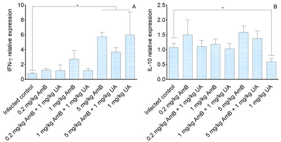 IFN-γ (A) and IL-10 (B) relative gene expression in the spleen of infected golden hamsters treated with amphotericin B (AmB), ursolic acid (UA), or AmB plus UA. Relative gene expression was estimated by quantitative PCR. The expression levels of genes of interest were normalized to β-actin. * p < 0.05 indicates statistical significance.