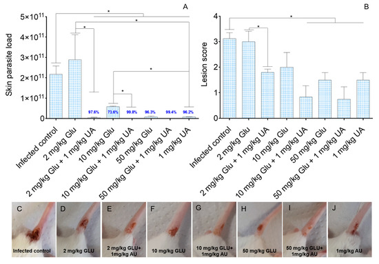 Infected BALB/c mice treated with 2.0 mg/kg of GLU showed no reduction in skin parasitism in comparison to the infected control (Figure 3A, p > 0.05). In comparison to the infected control, this treatment did not change the morphology of the skin lesions that were characterized by ulcerated and necrotic plates (Figure 3B–D, p > 0.05). On the other hand, when 2.0 mg/kg of Glu was associated with UA, a significant decrease in skin parasitism was observed, compared to the infected control and to animals treated with 2.0 mg/kg of Glu alone (Figure 3A, p < 0.05). Additionally, animals treated with 2.0 mg/kg of Glu plus UA presented skin lesions characterized by plaques of medium size in the base of the tail, which was smaller in comparison to the infected control and animals treated with 2.0 mg/kg of Glu alone (Figure 3B,E, p < 0.05). Animals treated with 10.0 mg/kg of Glu alone showed significant reduction in tissue parasitism (73.6%) compared to the infected control (p < 0.05), and a significative improvement in skin lesions was verified, characterized as infiltrative plaques of medium size (Figure 3B,F). When 10.0 mg/kg of Glu was associated with UA, significant reductions in skin parasitism were observed in comparison to skin parasitism from the infected control and animals treated with 10.0 mg/kg of Glu alone (p < 0.05). Both monotherapy and combined treatments improved the skin lesions morphology in comparison with the infected control (Figure 3B,F,G; p < 0.05). Animals treated with 50.0 mg/kg of Glu showed significant reduction in tissue parasitism of 96.3% in comparison with the infected control (Figure 3A), and when UA was associated with 50.0 mg/kg of Glu, the parasitism decreased by 99.4% compared to the infected control group (p < 0.05). Although less parasites were observed in the combined therapy (50.0 mg/kg of Glu plus UA), this difference was not significant (p > 0.05). Similarly, animals treated with 50.0 mg/kg of Glu alone or combined with UA showed infiltrative plaques of small size compared to the infected control (Figure 3B,H,I; p < 0.05). Comparatively, mono (50.0 mg/kg of Glu) or combined therapies (50.0 mg/kg of Glu plus UA) did not improve the overall aspect of skin lesions (p > 0.05). Animals treated with UA alone showed reduced skin parasitism in comparison with the infected control and animals treated with 2.0 and 10.0 mg of Glu (p < 0.05). Morphologically small infiltrative plaques were identified in the base of tail from animals treated with UA as monotherapy (Figure 3B,J; p < 0.05).