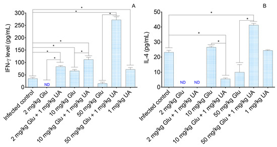 In comparison with the infected control (Figure 4B), IL-4 levels were increased in the group treated with the association between 50.0 mg/kg of Glu and UA (p < 0.05) and low levels of IL-4 were detected in animals treated with the association between 10.0 mg/kg Glu and UA (p < 0.05). Comparatively, it was observed that the association of 10.0 mg/kg of Glu with UA reduced the ability of lymph node cells to produce IL-4, and in contrast, the association of 50.0 mg/kg of Glu enhanced the ability of lymph node cells to produce IL-4, as illustrated in Figure 4B (p < 0.05).
