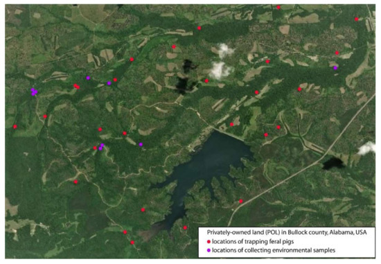 Locations at privately owned tract of land (POL) to trap feral pigs in this study. Feral pigs were trapped at a privately owned tract of land (POL) in Bullock County, 4515 hectares in east-central Alabama (latitude: 32.16857–32.70600 and longitude; 85.50155–85.57337). Feral pigs were trapped in 27 locations (red dots) while environmental samples were collected in 9 locations (purple dots). This figure was generated by the use of the software ArcMap 10.7.1(Redlands, CA, USA)