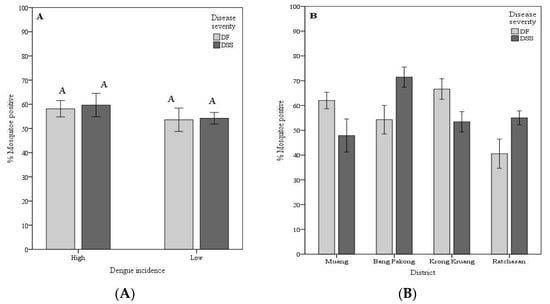 Vector competence of Aedes aegypti for dengue serotype 2 virus isolated from patients exhibiting different disease severity according to dengue incidence at the mosquito strain origin area (A), mosquito geographic origin, districts (B), and mosquito strains (C). Vector competence is expressed as the number of mosquitoes positive for viral RNA in head tissues/number tested. Bars and error bars show the mean percentage of positive mosquitoes and the standard error, respectively. Bars with the same letter within the same group are not significantly different (p < 0.05) based on Tukey’s test for means comparison.