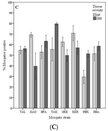 Variations in infection rates of A. aegypti experimentally infected with DEN virus has been reported [10,11,20,27,28,29,30]. Differences on the proportion of infected mosquitoes between DENV-2 with SEA and American genotype have also been reported in geographically separated A. aegypti populations [24,25,26]. In contrast to previous studies, the present study used low-passage virus isolates that were recently isolated from patients exhibiting different disease severity (i.e., DF and DSS), which were of sympatric geographic origin with the used A. aegypti strains. Although the A. aegypti were collected in the same province, considerable variability in overall infection rates was observed according to the dengue incidence in the collection area, geographic origin (districts), mosquito strain, individual virus isolate, and disease severity of the patients from whom the virus was isolated (Figure 1A–E).