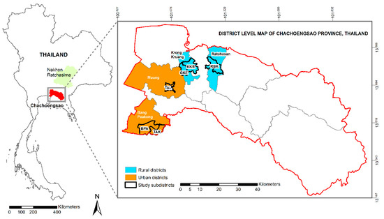 Collection sites: Four districts in Chachoengsao province situated in eastern Thailand, with the highest (Muang and Bang Pakong) and lowest (Krong Kruang and Ratchasan) dengue (DF/DHF/DSS) incidence (per 100,000 population) reported during the past 20 years were selected. Within these districts the sub-districts (tambon) with the highest (Na Muang, Bang Pakong, and Tha Kam) and lowest (Krong Kruang, Gon Kheo, and Bang Kla) dengue incidence from 1999 to 2002 were selected as mosquito collection sites (Figure 4). Sub-districts were classified as high and low dengue risk areas based on annual incidence of DHF/DSS (cases/100,000 habitants), and the number of houses and inhabitants per square kilometer. The selected locations covered a wide geographical distribution of A. aegypti, including urban and rural environments. The shortest distance between study areas (districts) was ca. 20 km, and between sub-districts was ca. more than 30 km.