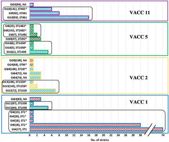 Comparison of the number of strains per MLVA8(12)-Genotype (Gt) of the isolated 180 L. pneumophila strains and their respective sequence types (ST). Each group of bars, outline color and colored frame indicate VACCs as follows: blue outline represents VACC1, yellow outline represents VACC2, green outline represents VACC5 and purple outline represents VACC11. The black round-edged frames indicate the group of genotypes from the same ST. The wide upward diagonal hatches inside the bars indicate Sg as follows: Sg1—red, Sg 6—sky blue, Sg8—green, Sg10—yellow and Sg2 to Sg14—black. NA—not available ST; *, ST was assessed for strains of the same MLVA-8(12) genotype, and not directly for the West Bank strains; ^, ST was estimated from the MLVA-8 pattern.