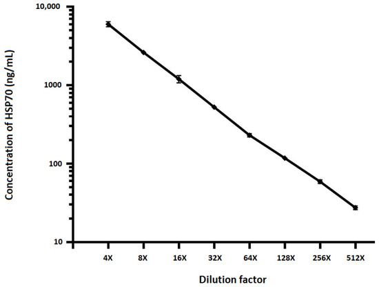 Our assay offers the advantage of a robust dilution linearity in the measurements of samples spiked with HSPs in the range of 4- to 512-fold dilution. This huge range of dilution linearity indicates that samples with HSP concentration highly above the calibration range can be diluted into range without affecting the precision of the assay, thus expanding the application of the assay to samples that have a much wider range of HSP levels. On the other hand, in non-linear assays, accurate measurements can be obtained only for samples whose values are within the calibration range [47]. Additionally, in the present assay, the admixture of two plasma samples—exhibiting very low and high levels of HSP70—portrayed linear results, suggesting that measurements from all parts of the calibration curve are reliable. Additionally, the dilution of samples mitigates matrix effects, which represents a hallmark in the accurate measurement of analytes by ELISA [48].