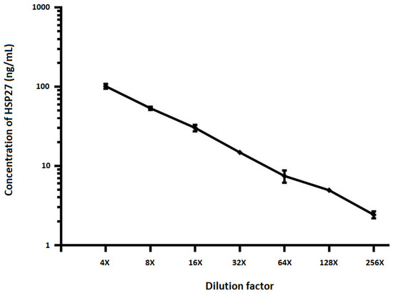 To determine matrix related effects of test samples and minimum required dilution, a plasma sample was spiked with recombinant HSP70 (see Figure 1) and HSP27 (see Figure 2) proteins and twofold serial dilutions were performed using sample diluent. Samples were pre-diluted four-folds and run in duplicate alongside full calibration curve. All sample concentrations were determined using the calibration curve from the run. The percent recovery mean and range of recovery at each dilution was calculated using the following equation: (Concentration of diluted sample/Concentration of neat sample) × 100. The HSP levels assayed after serial dilution of samples portrayed dilutional linearity (on average 109%, R2 = 0.998, p < 0.001 for HSP27 and 93%, R2 = 0.994, p < 0.001 for HSP70).