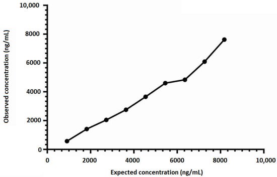 To determine the linearity of sample reads along the entire calibration curve and to ensure that measurements from all parts of the calibration curve are reliable, an admixture of two plasma samples (including a sample exhibiting a low HSP70 concentration and a sample spiked with 10,000 ng/mL of human recombinant HSP70) was performed. A high linear response was also demonstrated with admixtures of plasma samples (R2 = 0.982, p < 0.001; see Figure 3).