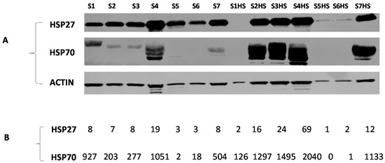 In order to evaluate the utility of the assays for HSP27 and HSP70 measurement, peripheral blood mononuclear cells from samples from 7 independent volunteers were prepared and lysed immediately or heat shocked at 42 °C—a well-known inducer of HSPs—before lysis. As expected, the intracellular levels of HSP70 increased significantly after heat shock (p < 0.001). For samples 1, 5, and 6, the water in the water bath—where samples were heat shocked—penetrated the Petri dishes. However, we decided not to discard them, but rather to use them—for comparison purpose—in both the SIMOA and Western blotting techniques (see Figure 4). In addition, the levels of HSP27 and 70 obtained with the present technique were compared with their relative values determined by Western blotting. Relative HSP values obtained using Western blotting correlated significantly with HSP values of the present SIMOA technique (r = 0.815, p < 0.001 and r = 0.895, p < 0.001 for HSP70 and HSP27, respectively), indicating that the two methods are comparable (see Figure 4 and Supplementary Figure S1).