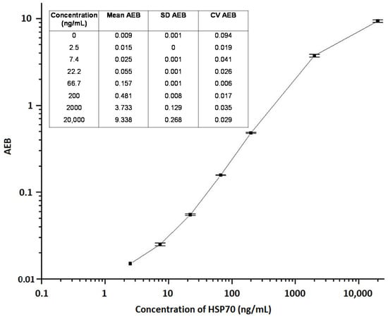 Controls and panels (two each) were prepared by spiking HSP70 peptide (SPP-755) into calibration diluent and plasma, respectively, at two different levels (2000 and 66.7 ng/mL). For HSP27, human recombinant HSP27 peptide (ADI-SPP-715) was spiked into calibration diluent at two different levels (500 and 125 ng/mL). The samples were stored at −80 °C until use. Intra- and inter-assay precision were determined by testing the panels (six replicates per panel) and controls (six replicates per control), repeated on four separate days. Within-run CV was calculated for each of the panels and controls (n = 6). Inter-assay precision was determined by averaging the results from different days (n = 4) and calculating the CV% for each sample. The inter- and intra-assay coefficients of variation were less than 20% in all tested conditions (see Table 3 and Supplementary Table S1).