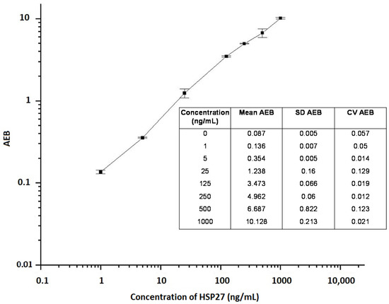 To evaluate the assay, human recombinant HSPs were used to generate standard curves under optimized conditions—by a serial dilution into calibration diluent at 8 points including blank (0–1000 ng/mL for HSP27 and 0–20,000 ng/mL for HSP70). The mean of average enzymes per bead, standard deviation (SD), and percentage coefficient of variation (CV%) were calculated for each calibrator level and the blank. The limit of detection (LOD) of the assay was estimated as blank + 2SD, and the average LOD of the ten curves was 0.16 and 2 ng/mL—for HSP27 and HSP70, respectively—and was calculated by averaging the values of all blank + 2SD.